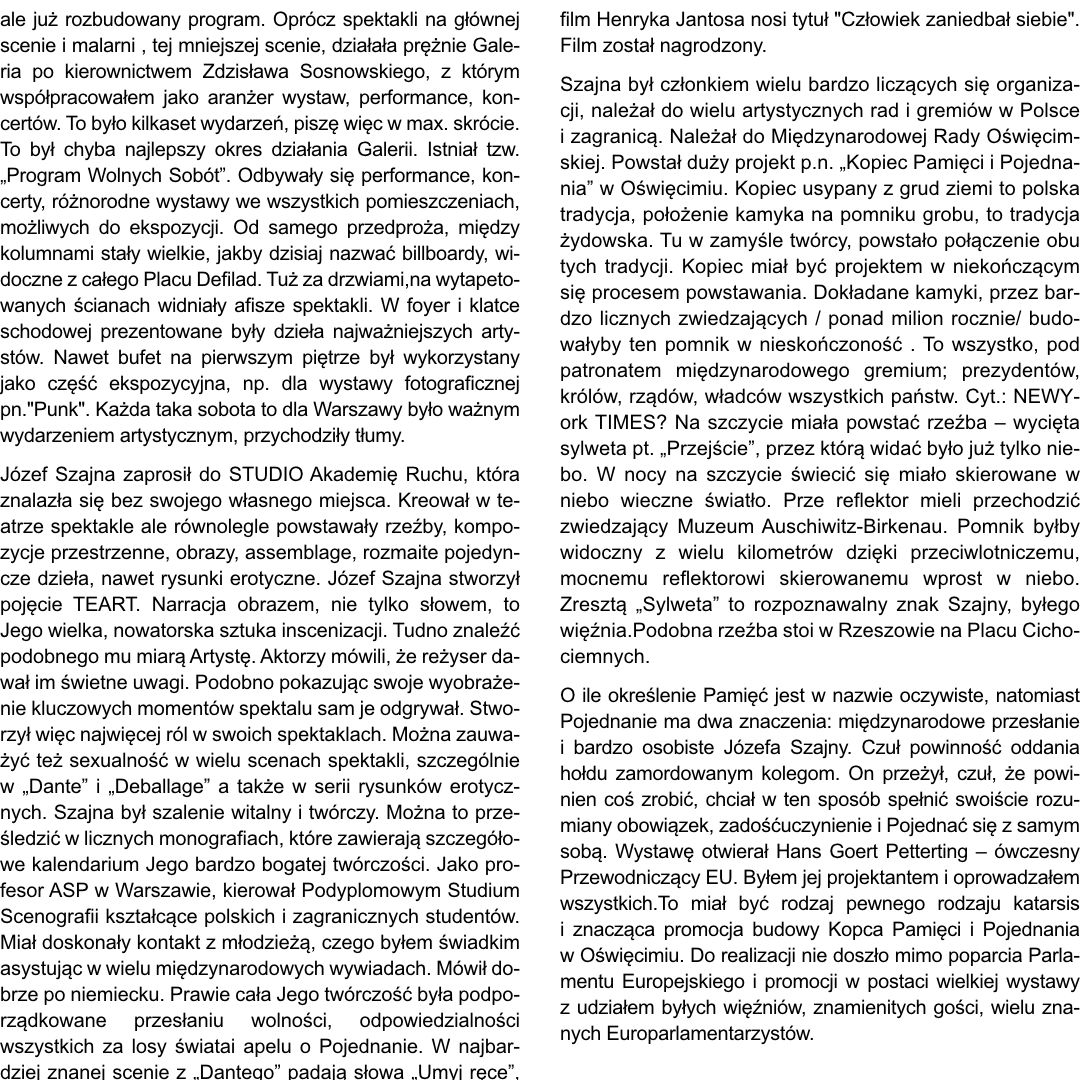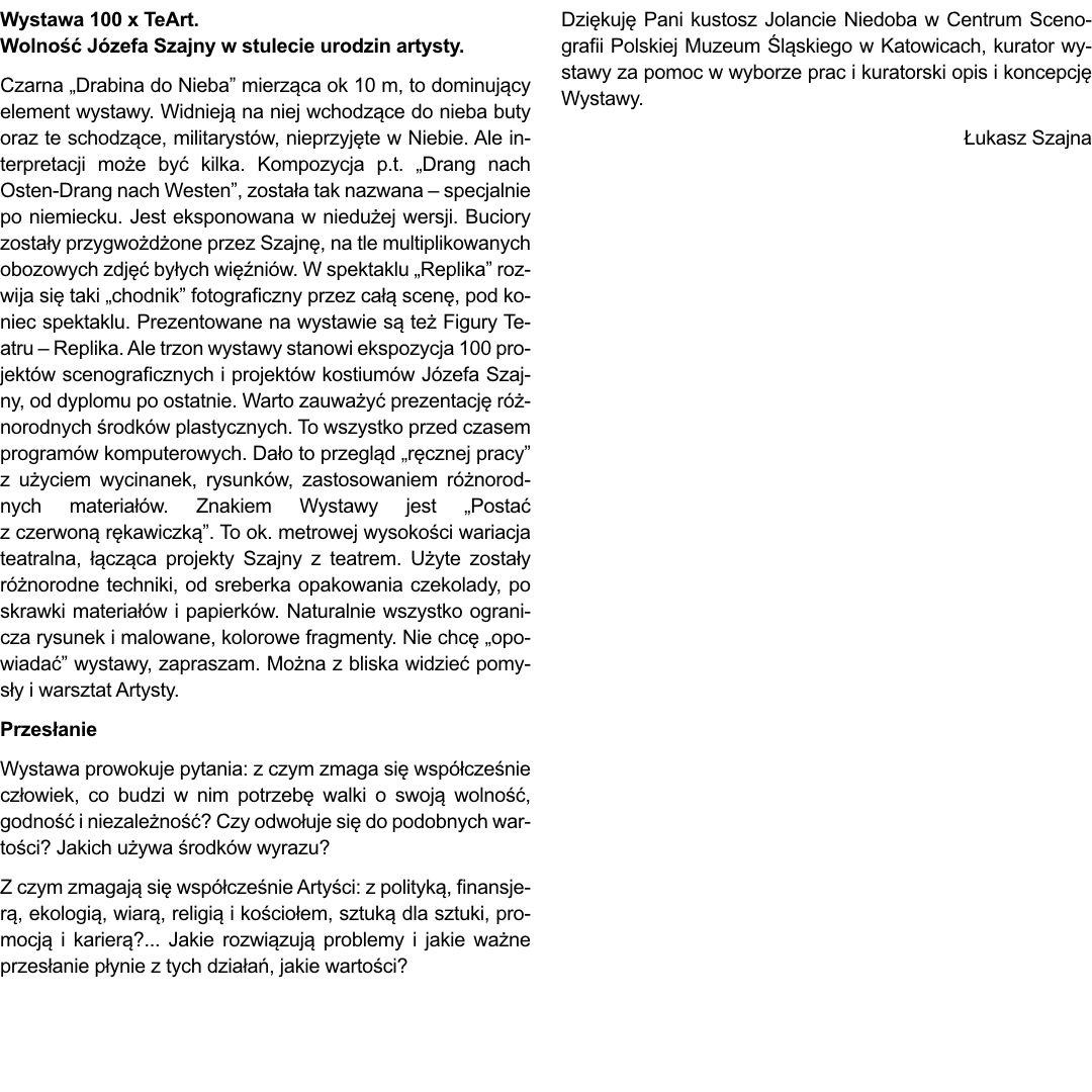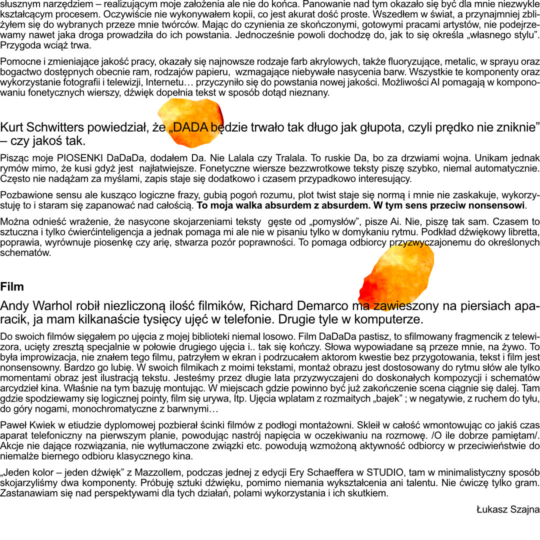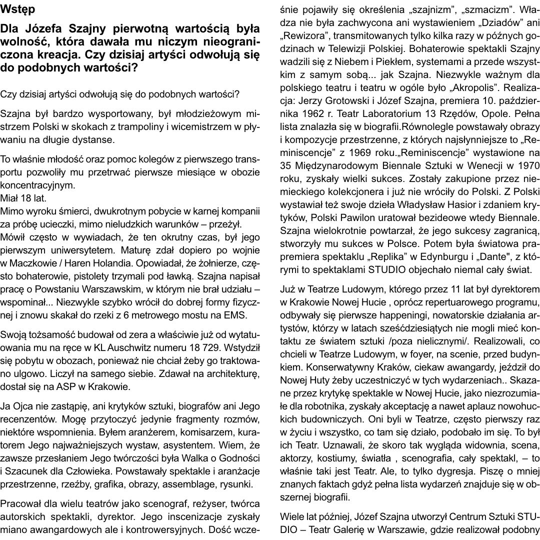 Od 2005 roku tworzy w Gdańsku- Oliwie własną agencję Szajna Studio. Współpracuje z muzeami i galeriami w Polsce i za granicą, maluje obrazy, tworzy filmy, fotografuje. Mieszka w Gdańsku- Oliwie gdzie przygotowuje własne wystąpienia i wystawy sztuki.